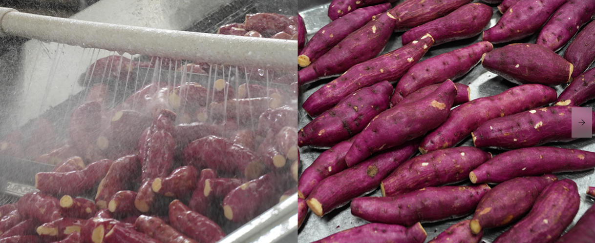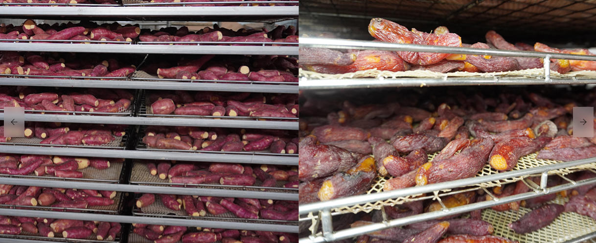 In unserer Produktionslinie verwenden wir ein dreifaches Dämpf- und Trocknungsverfahren. Langsames Backen entfaltet das Aroma. Durch einmaliges Dämpfen und Backen erhalten die Süßkartoffeln ihre Form und Festigkeit. Zweimaliges Dämpfen und Backen verstärkt die Süße und erhöht die Zuckerkonzentration. Dreimaliges Dämpfen und Backen sorgt für eine weiche, klebrige und süße Konsistenz.